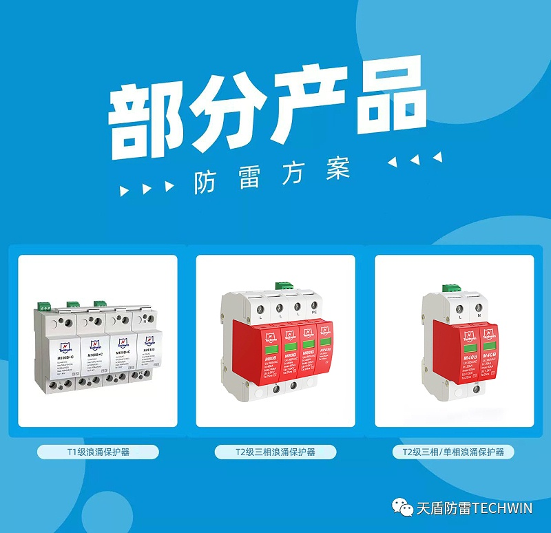3) 三级防雷设备:在终端配电箱或设备配电箱(柜)处安装了至尊国际Techwin品牌M40B4/M40B2的Imax=40kA(8/20μs)T2级三相/单相浪涌保护器。这些C类浪涌保护器在设备端进线处给予精细防护,保护设备的平稳安全运行。
